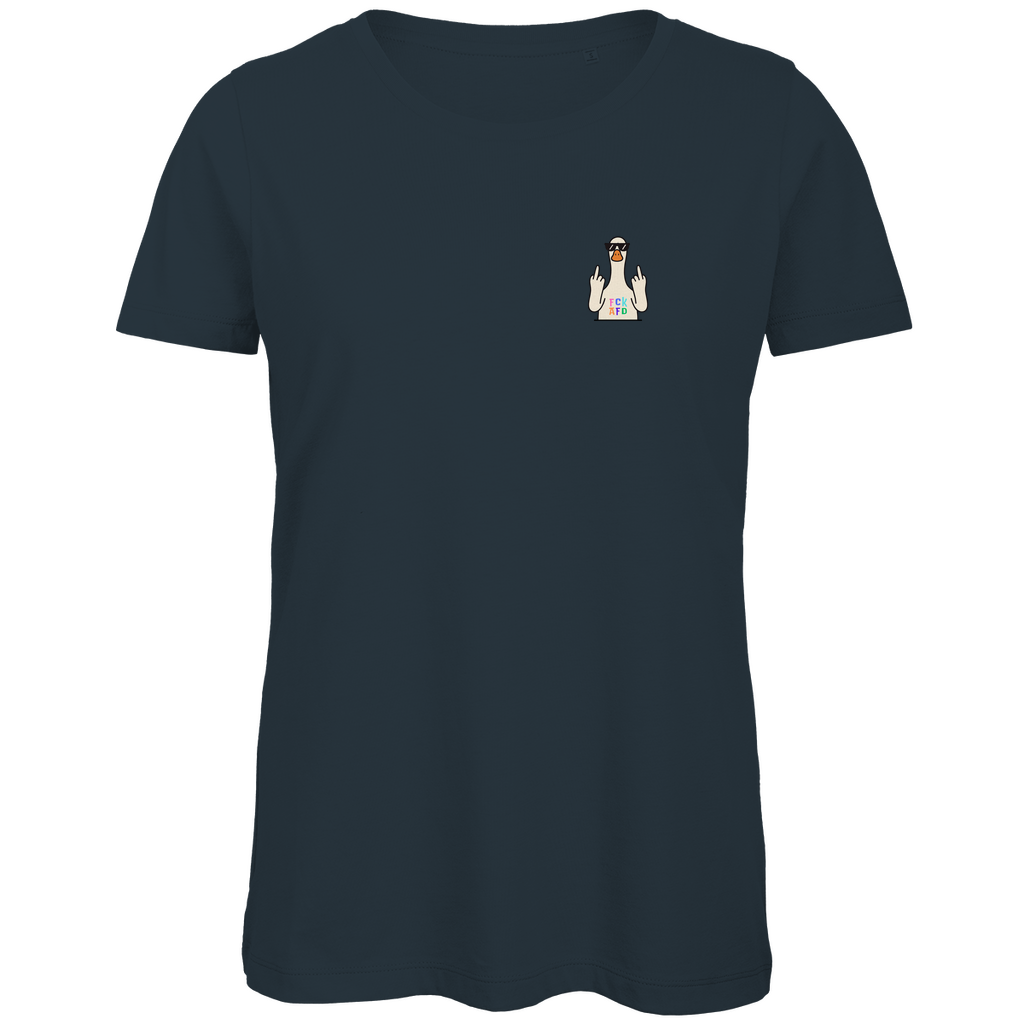 Klare Haltung, cooler Style: 100 % gekämmte Bio-Baumwolle, femininer Medium Fit, Seitennähte, leichter Stoff, moderner Rippkragen. Fair produziert – weil Meinung und Mode Hand in Hand gehen.